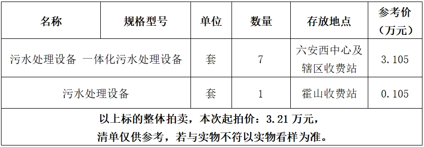 1、污水處理設(shè)備一批,起拍價(jià):3.21萬元,競(jìng)買保證金:1萬元。標(biāo)的詳情見下方所附清單: