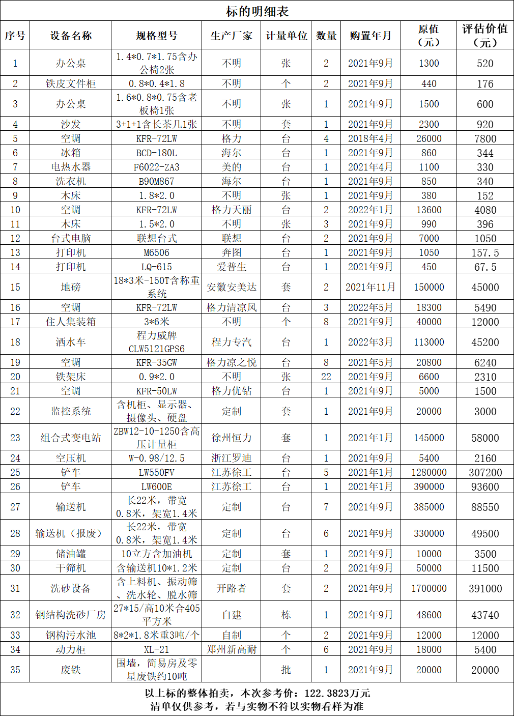 一、拍賣標(biāo)的:洗砂設(shè)備一套、LW550FV、LW600E江蘇徐工鏟車、組合式變電站、灑水車、地磅等二手機器設(shè)備一批,參考價:122.3823萬元,競買保證金:15萬元。成交后,委托方提供13%的增值稅發(fā)票。