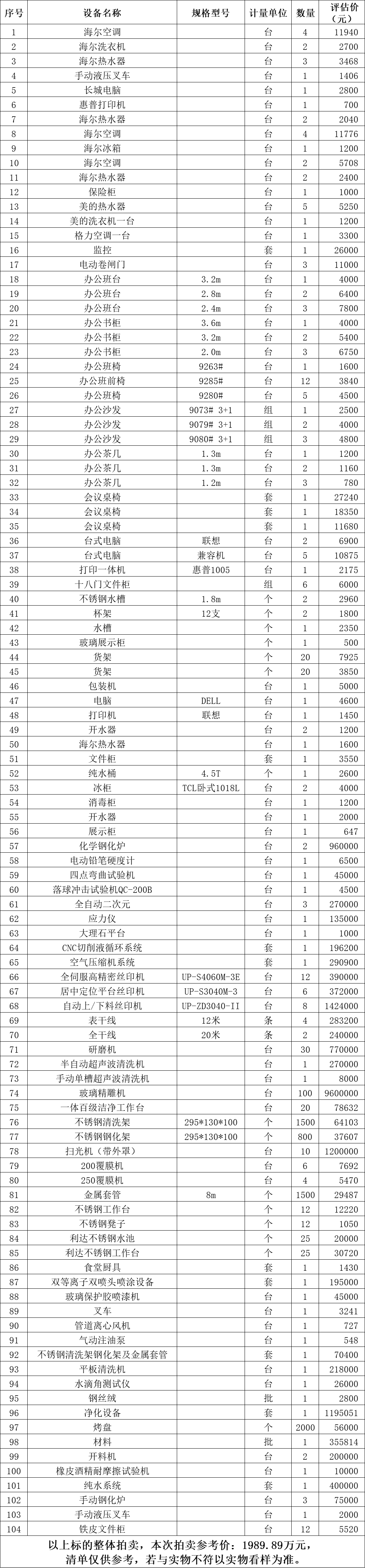 以現(xiàn)狀拍賣,現(xiàn)狀移交。標(biāo)的清單見下方表格。所附清單上標(biāo)的的數(shù)量及規(guī)格型號、廠家等信息僅供參考,若與實(shí)物不符以實(shí)物看樣為準(zhǔn),成交后以現(xiàn)場實(shí)物為準(zhǔn)移交。成交后,委托方提供增值稅專用發(fā)票。