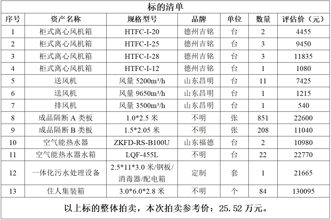一、拍賣標的:六安市中醫(yī)院閑置資產(chǎn)一批,包括:一體化污水處理設(shè)備、柜式離心風機箱、空氣能熱水器、送風機等,參考價:25.52萬元,競買保證金:2萬元。