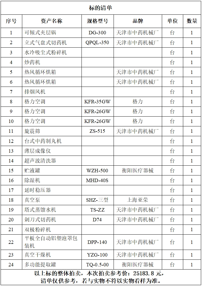 一、拍賣標(biāo)的:六安市中醫(yī)院制劑室報(bào)廢設(shè)備一批,包括組合空調(diào)箱、真空干燥機(jī)、平板全自動(dòng)鋁塑泡罩包裝機(jī)、風(fēng)冷模板等,參考價(jià):25183.8元,競(jìng)買保證金:5000元。