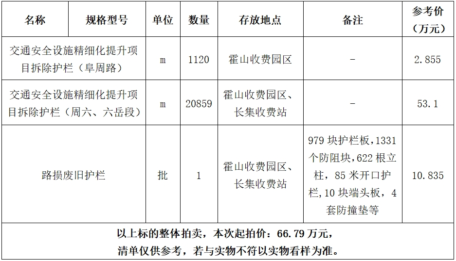 2、廢舊護(hù)欄一批,起拍價(jià):66.79萬元,競(jìng)買保證金:5萬元。標(biāo)的詳情見下方所附清單: