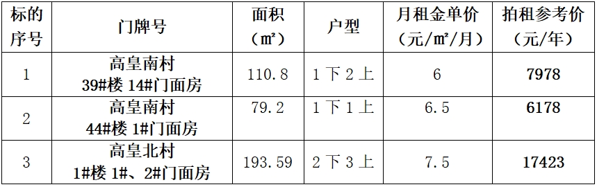 一、拍租標的:六安市裕安區(qū)平橋工業(yè)園高皇南、北村安置小區(qū)部分門面房3年期租賃經(jīng)營權(quán),標的詳情見下表: