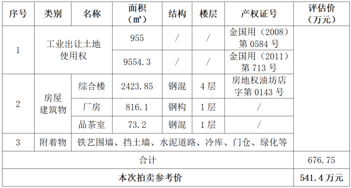 以上標(biāo)的整體拍賣,參考價(jià):541.4萬元,競買保證金:50萬元。