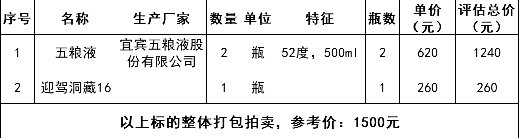 2、五糧液酒2瓶、迎駕洞藏16酒1瓶,整體打包拍賣,參考價:1500元,競買保證金:1000元。標的詳情見下方清單: