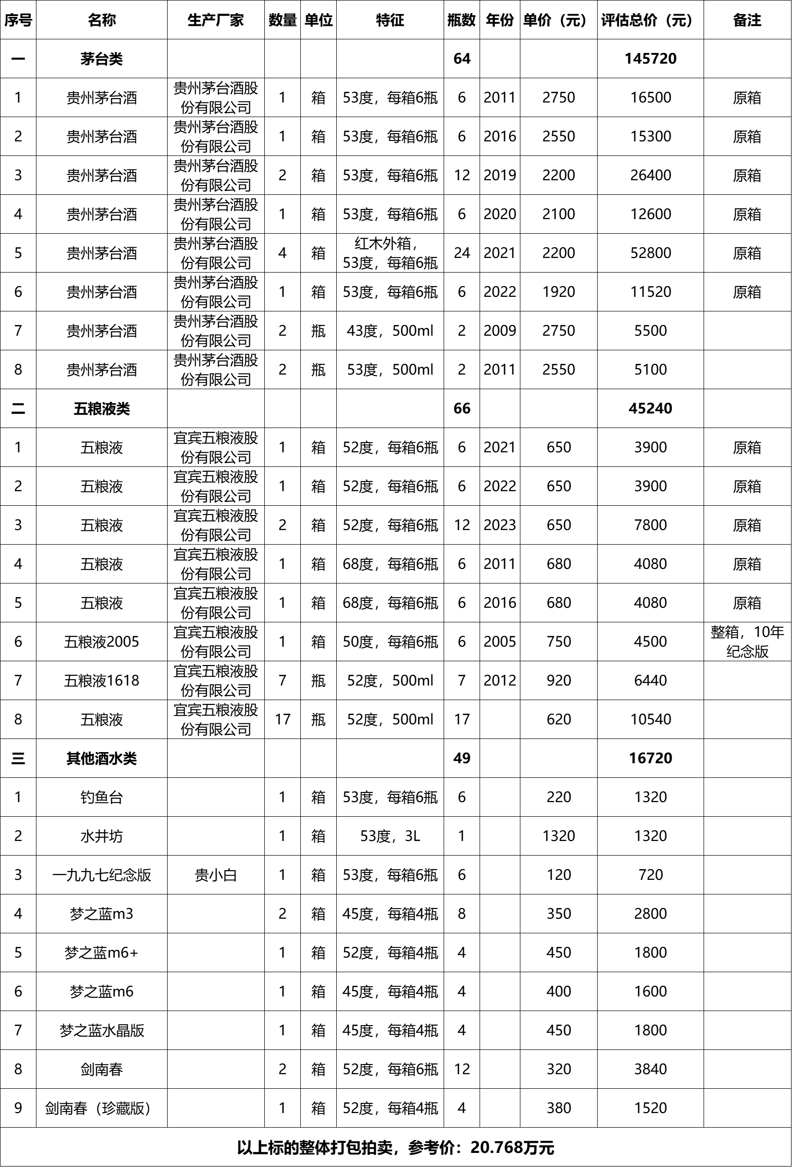 1、貴州茅臺酒計64瓶、五糧液酒計66瓶及其他類酒水計49瓶,整體打包拍賣,參考價:20.768萬元,競買保證金:2萬元。標的詳情見下方清單: