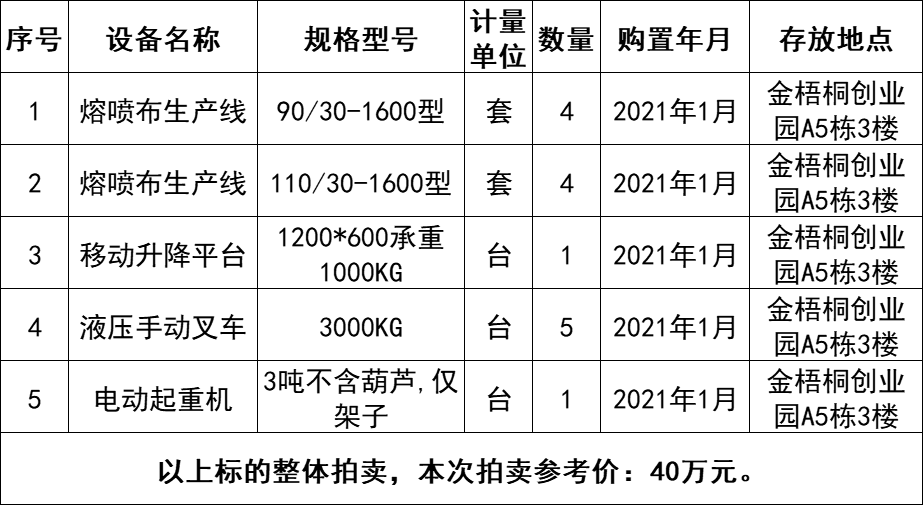 一、拍賣標(biāo)的:熔噴布生產(chǎn)線及配套機器設(shè)備一批,打包拍賣,參考價:40萬元,競買保證金:8萬元。標(biāo)的詳情見下方清單(清單僅供參考,若與實物不符以實物看樣為準(zhǔn))。