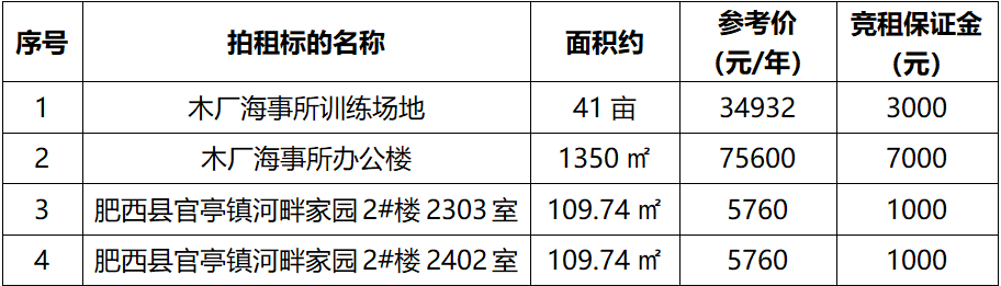三、注意事項:有意競租者請交納保證金至賬戶:安徽邦德拍賣有限公司,開戶銀行:中國工商銀行股份有限公司六安解放路支行,賬號:1314202409300068442,并于拍賣會前完成網(wǎng)上報名手續(xù)。競買不成,保證金5個工作日內無息退還。成交后,買受人需向中拍平臺支付0.15%軟件使用費。