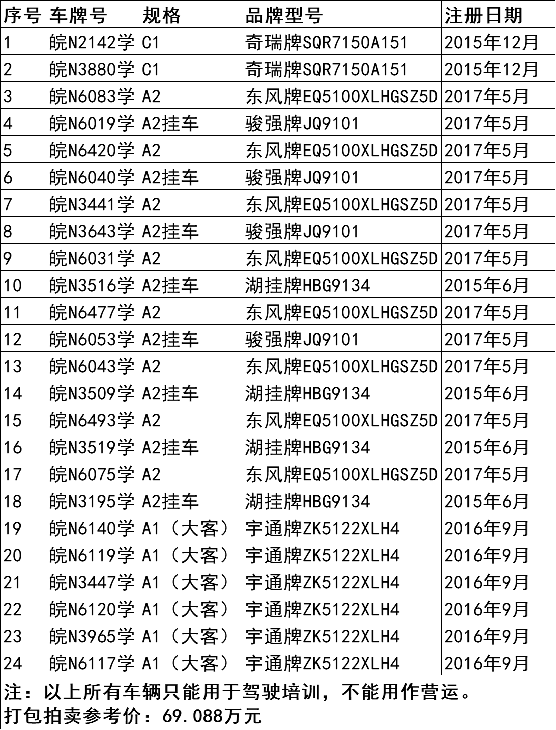 3、皖N2142學(xué)、皖N3880學(xué)奇瑞牌小轎車、皖N6140學(xué)宇通牌大客等24臺二手車,打包拍賣。參考價:69.088萬元,競買保證金:8萬元。標(biāo)的詳情見下方表格:
