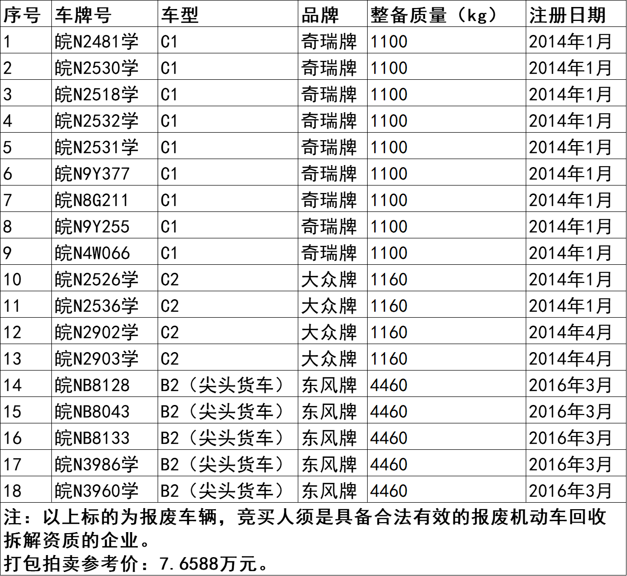 1、皖N2481學(xué)奇瑞牌小轎車、皖N2526學(xué)大眾牌小轎車、皖NB8128東風(fēng)牌尖頭貨車等18臺報廢車,打包拍賣。參考價:7.6588萬元,競買保證金:2萬元。標(biāo)的詳情見下方表格: